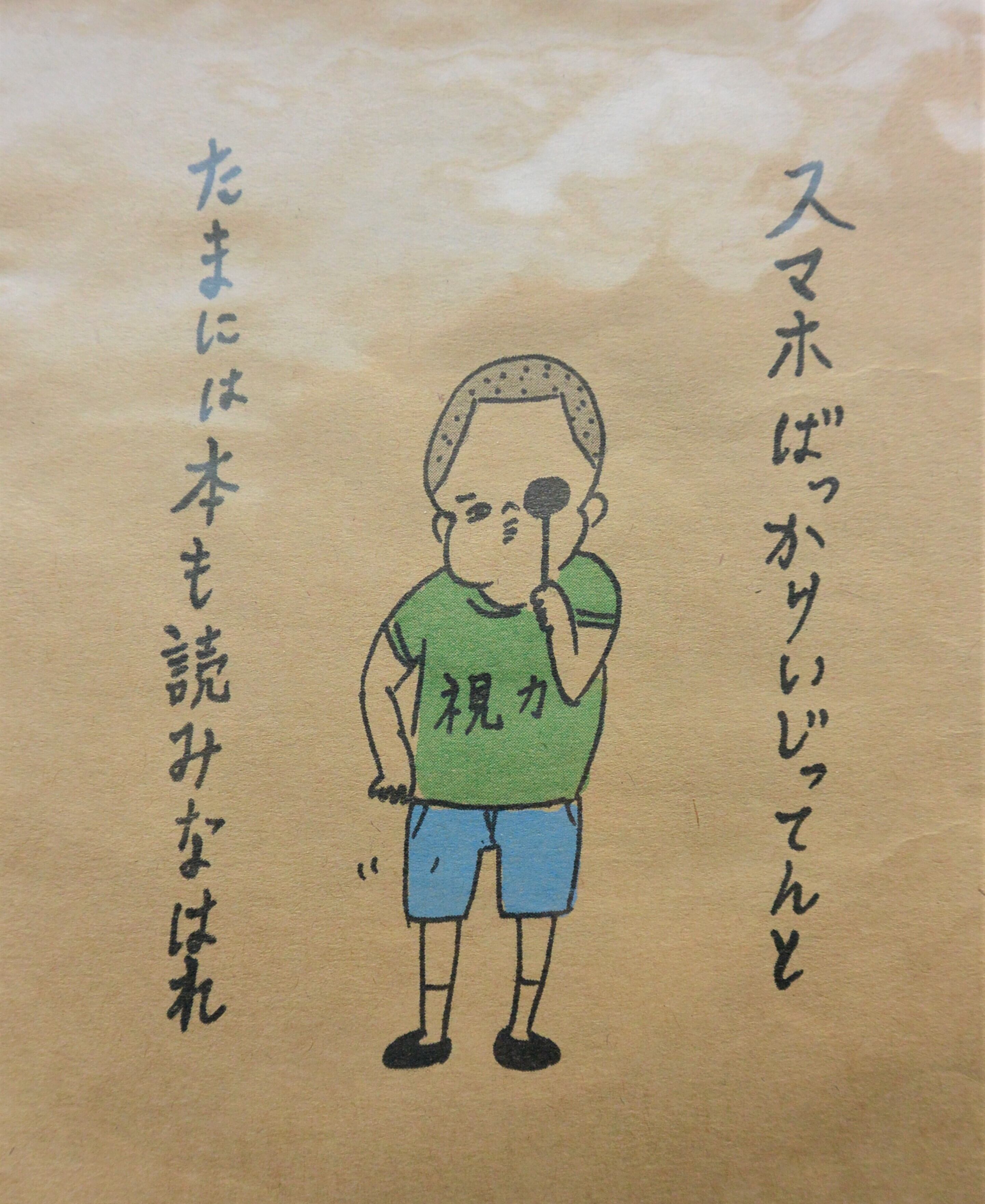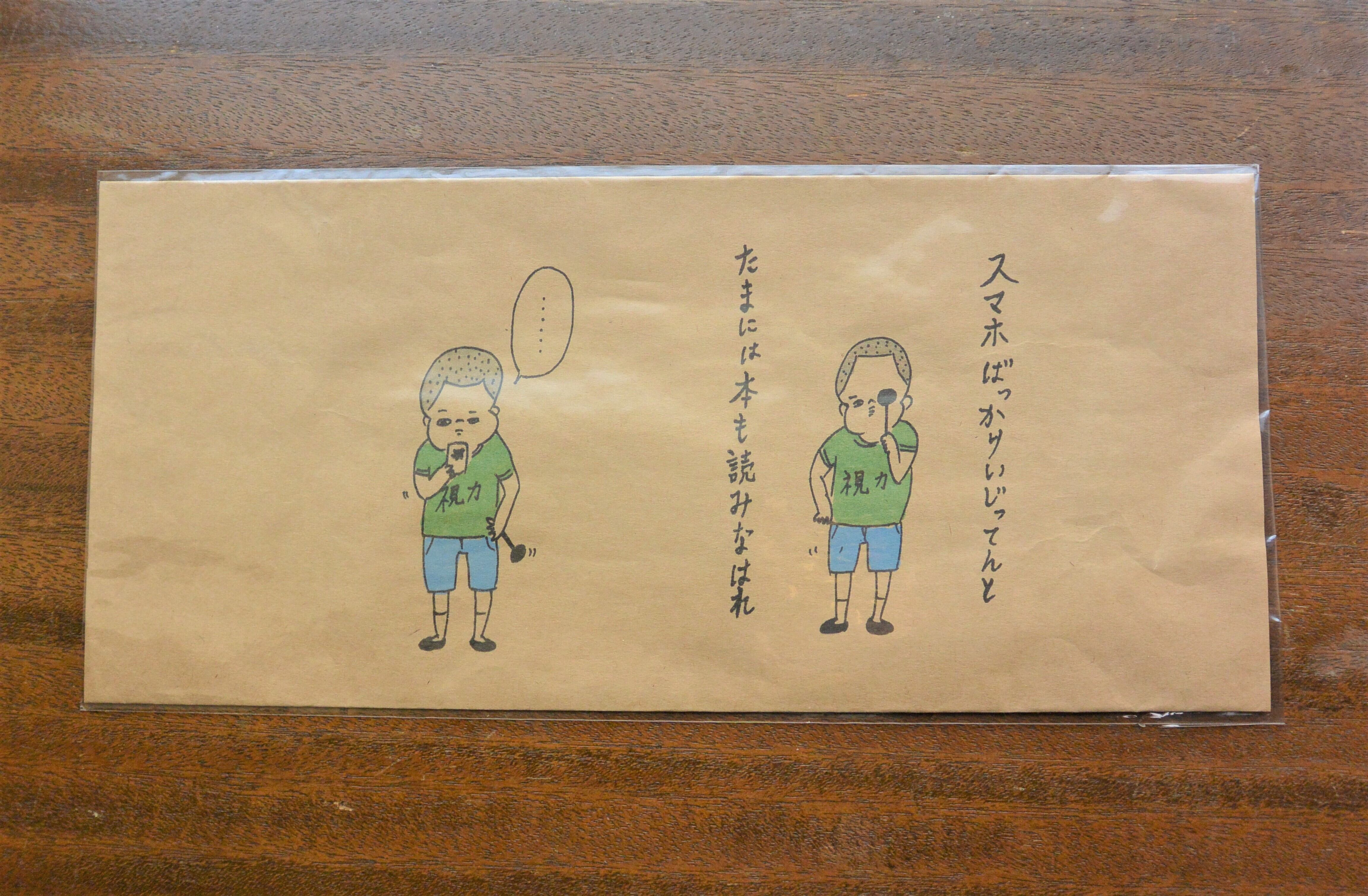「スマホばっかりいじってんと、たまには本も読みなはれ」 紙製のブックカバー(クラフト紙/光沢紙)2枚セットです。 家にいる時間が増える今日この頃、 ブックカバーチェンジで気分転換いかがですか。 文庫本サイズに上下を折ってありますが、 おりなおせばハードカバーサイズにもできます。 (その時は絵柄が真ん中に寄ってしまいますが) ゆるい シュール かわいい ナチュラル 関西弁